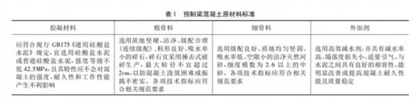 在預(yù)制梁的生產(chǎn)過程中,對(duì)于原材料的選擇是非常重要的,即要對(duì)施工材料品質(zhì)進(jìn)行控制。預(yù)制混凝土梁的原材料包括膠凝材料、粗骨料、細(xì)骨料和外加劑等,其控制標(biāo)準(zhǔn)如表1所示。
