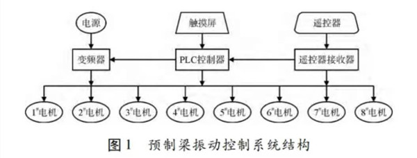 對(duì)控制柜的研究主要是研究振動(dòng)控制系統(tǒng),該振動(dòng)控制系統(tǒng)擬采用15kW變頻器,與PLC控制器采用 Modbus通訊協(xié)議連接,接收來自PLC的控制指令。一臺(tái)變頻器拖動(dòng)8臺(tái)1.5kW的振動(dòng)電機(jī),通過接收PLC控制指令改變自身輸出頻率來改變振動(dòng)電機(jī)的運(yùn)行狀態(tài),同時(shí)PLC控制器輸出指令控制振動(dòng)電機(jī)的運(yùn)行與停止。采用觸摸屏與PLC控制器通訊,可用于修改以及顯示振動(dòng)機(jī)低頻、中頻、高頻的運(yùn)行時(shí)間。該控制系統(tǒng)既可以操作臺(tái)操作,也可以遙控器操作。預(yù)制混凝土梁自動(dòng)振搗控制系統(tǒng)結(jié)構(gòu)如圖1所示。